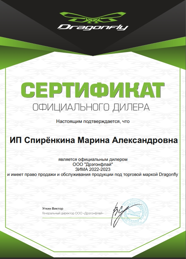 • Сертификат официального дилера "Dragonfly" Сертификат официального дилера "Dragonfly"
