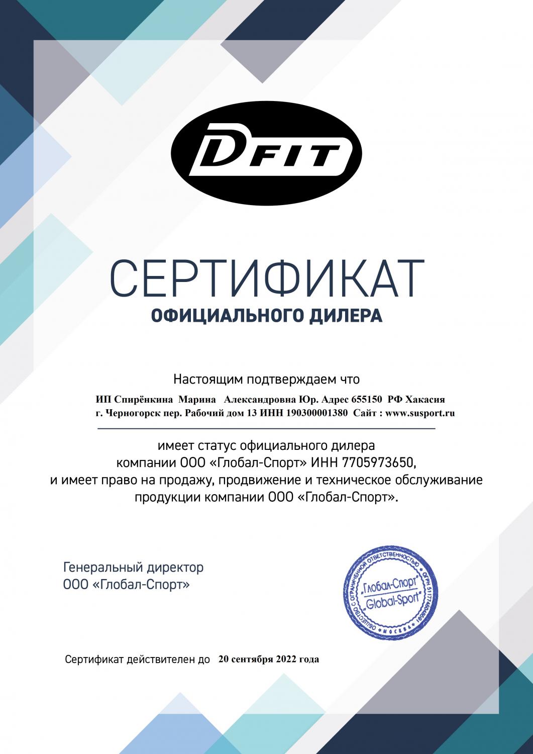 • Сертификат официального дилера "Dfit" Сертификат официального дилера "Dfit"
