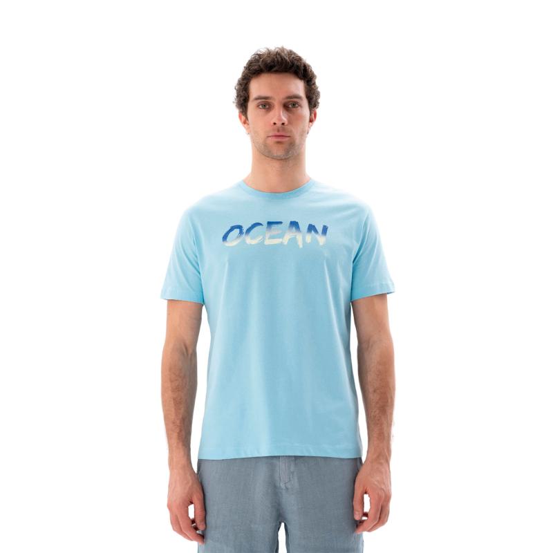 - Стильный голубой дизайн с крупной надписью на груди